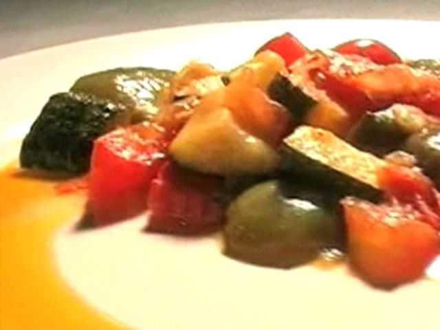 Рецепт тушеных овощей.Состав:перец — 2 штуки;лук — 1 штука;кабачки — 2 штуки;помидоры — 3 штуки;масло, соль.