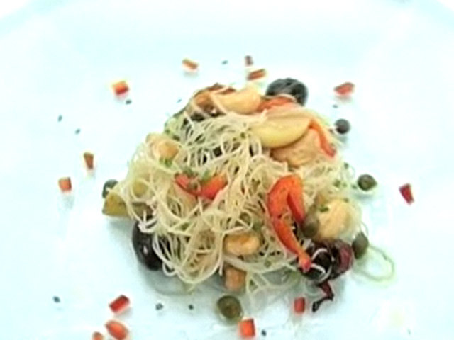Рецепт приготовления вкусной рисовой лапши.Состав:рисовая лапша — 30 гр;оливки — 7 штук;чеснок — 2 зубчика;каперсы — 1 столовая ложка;перец — 30 гр;кешью — 30 гр;оливковое масло, соль.