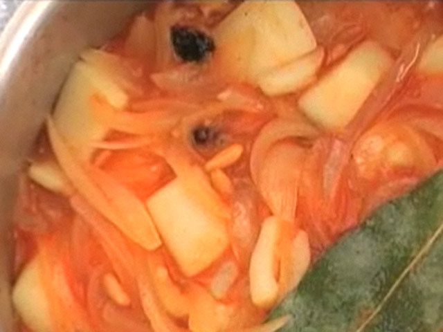 Рецепт испанской кухни.На 2 порции: каракатица — 1 штука;лук — 2 штуки;чеснок — 1 зубчик;томатный сок, изюм, кедровые орехи, лавровый лист, бренди, паприка, черный перец, оливковое масло, соль.