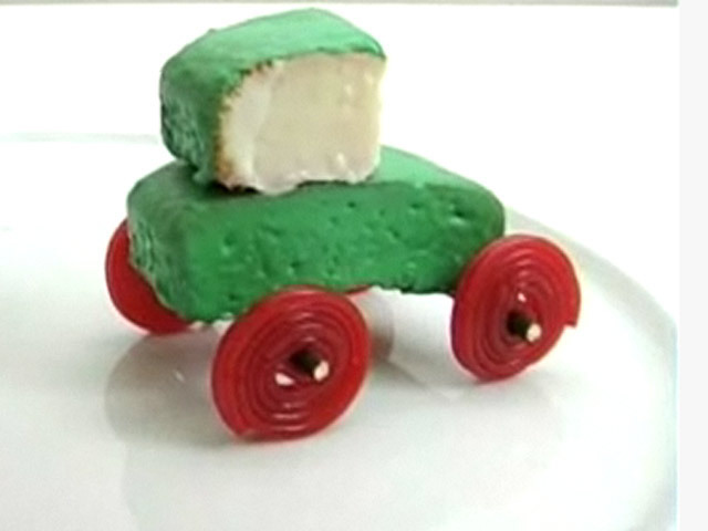 Забавный десерт из бисквитов.Состав:бисквитное пирожное — 3 штуки;яйцо — 1 штука;шоколадные палочки — 4 штуки;лакрица, сахарная пудра, красный краситель, зеленый краситель.