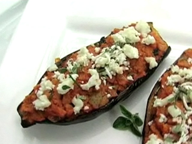 Рецепт фаршированных баклажанов с сейтаном.Состав:баклажан — 1 штука;козий сыр — 60 гр;томатный соус — 100 гр;лук — 1 штука;сейтан — 120 гр;оливковое масло, перец, соль, орегано.