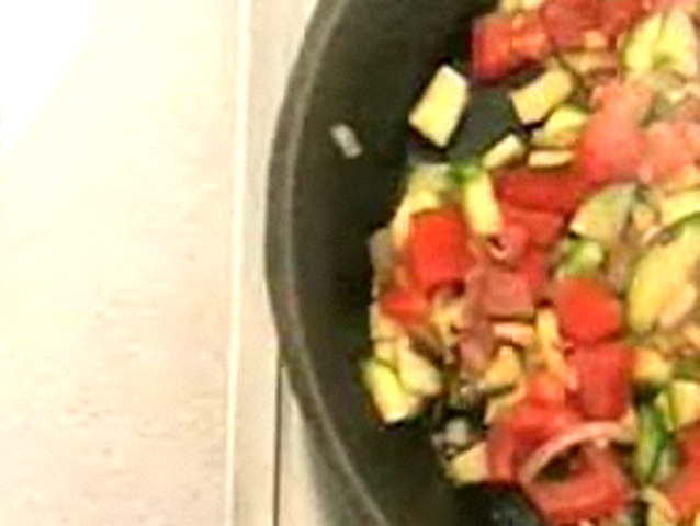 Рецепт овощных хлопьев.Состав: баклажан — 1 штука;помидоры — 3 штуки;цукини — 2 штуки;бекон — 5 кусочков;лук — 1 штука;чеснок — 3 зубчика;оливковое масло, соль, перец, розмарин.