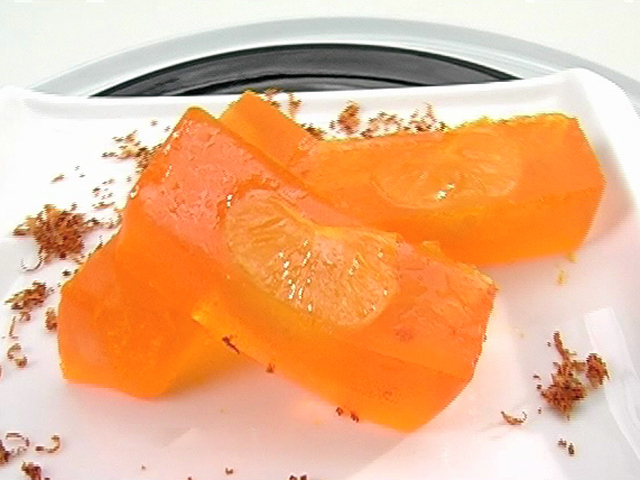 Простой десерт из солнечных мандаринов.Состав:мандарины — 9 долек;апельсиновый желатин — 100 гр;вода — 2 стакана.