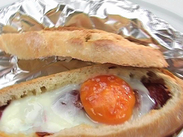 Вкусный завтрак для всей семьи.Состав:чоризо — 50 гр;яйца — 2 штуки;булка — 1 штука;соль по вкусу.