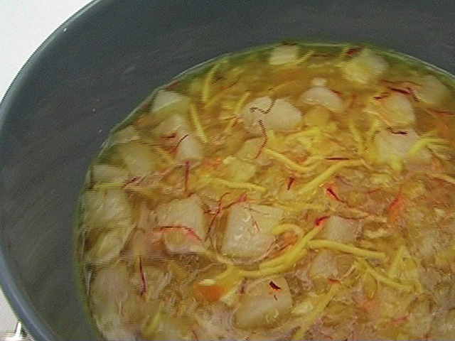 Каталонский суп.Состав:лук — 1 штука;сельдерей — 1/2 стебля;морковь — 1 штука;турнепс — 2 штуки;картофель — 1 штука;капуста — 100 гр;бекон — 50 гр;вермишель — 30 гр;рис — 30 гр;соль, перец, шафран — по вкусу.